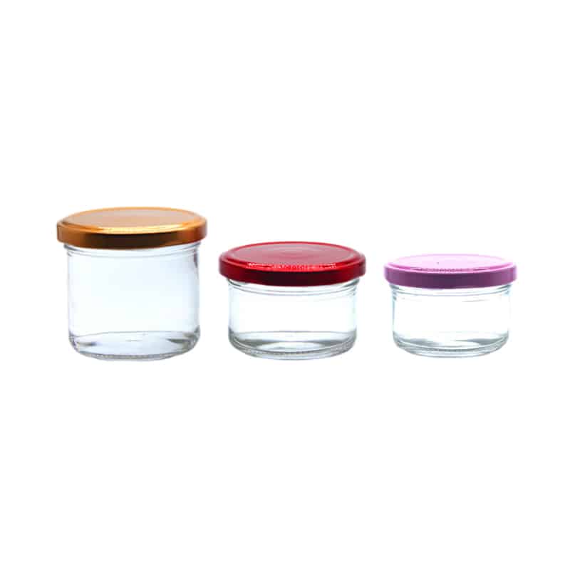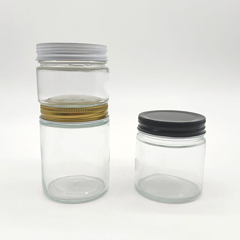 - Round clear/amber straight-sided 4 oz glass jars with plastic lids, screw tinplate lids or bamboo lids,
